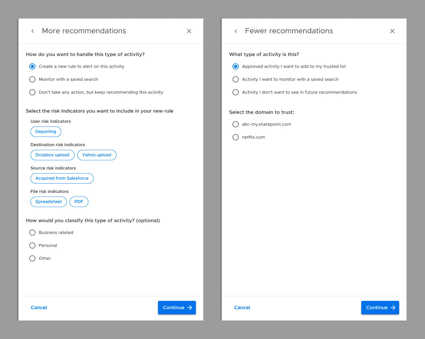 Alerts are an important part of a security tool. The more data you have, the harder it is to maintain actionable, proactive notifications. I led an effort to design a new rule builder that leveraged the different facets of our risk scoring system into an interface that was easy to configure and manage.Traditional rule builders require complex forms with explicit criteria and can be hard to fully understand their effectiveness, especially for less experienced analysts. My designs leveraged a simple approach that only required the user to select the indicators they were primarily interested in. When paired with a critical status indicator, an organization would only be notified when a file event contained other high-risk indicators. All without having to specify additional indicators individually.